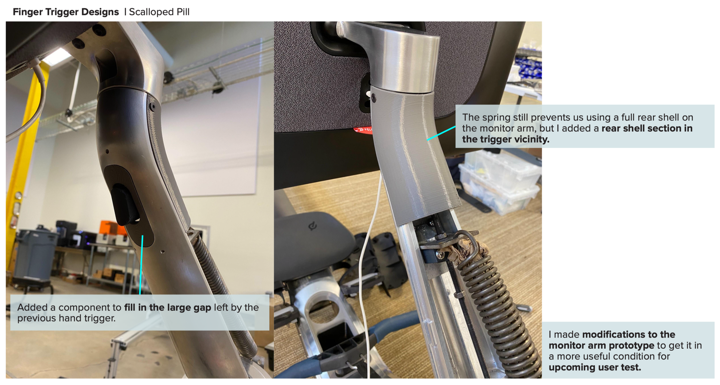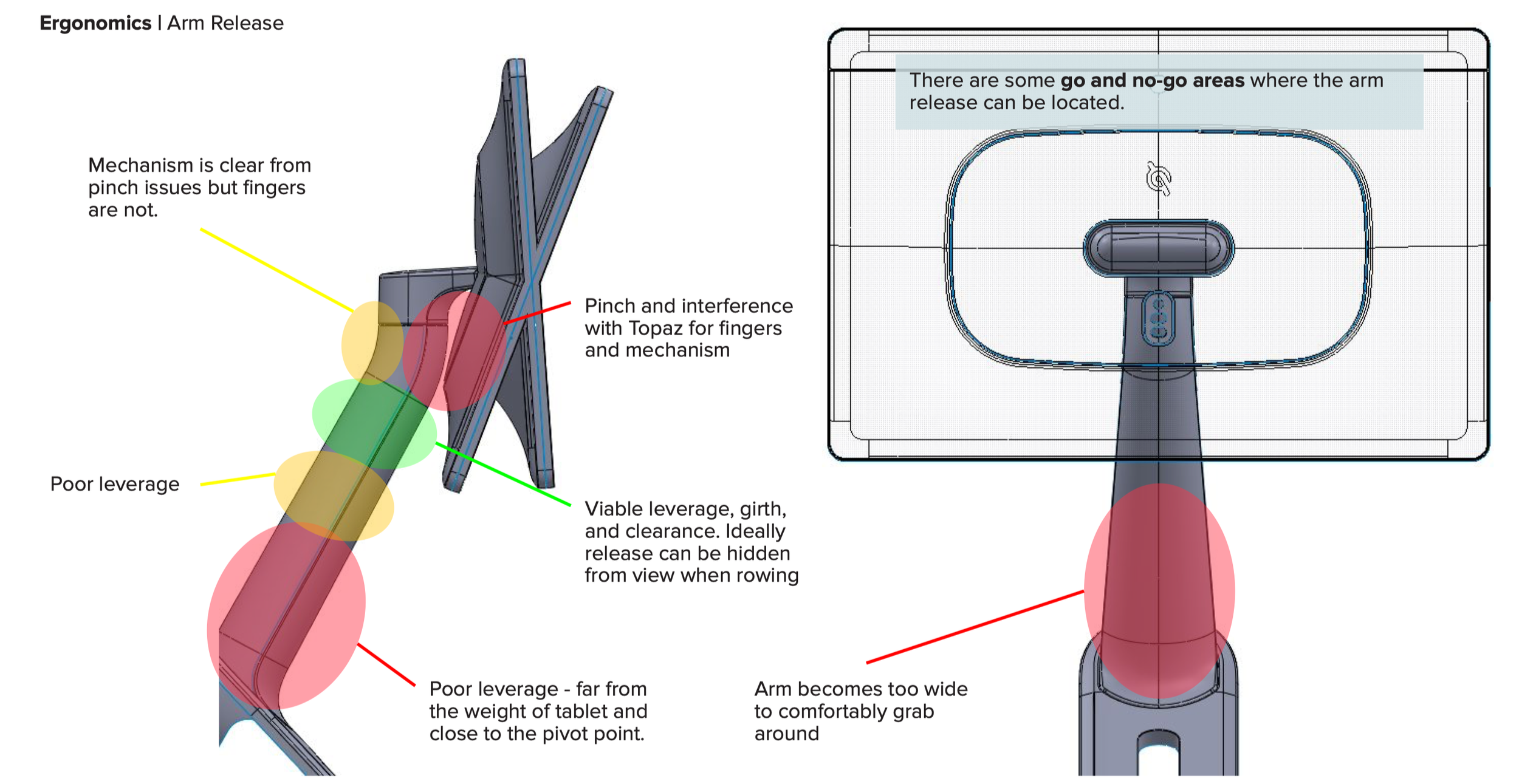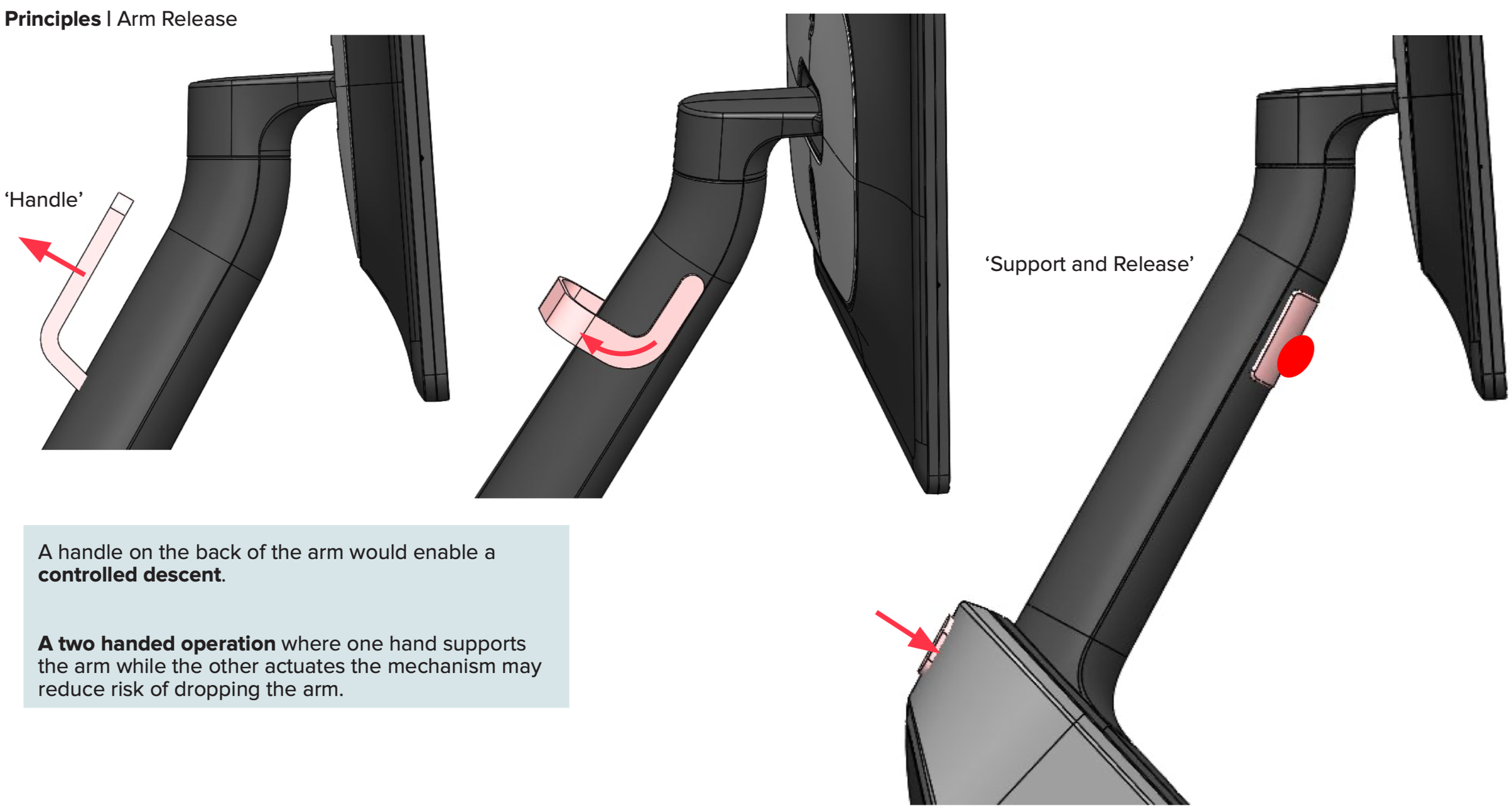 The monitor arm is collapsible for stowage. I spent many rounds iterating on the latch mechanism, working with engineers to achieve a safe, robust, and intuitive solution.